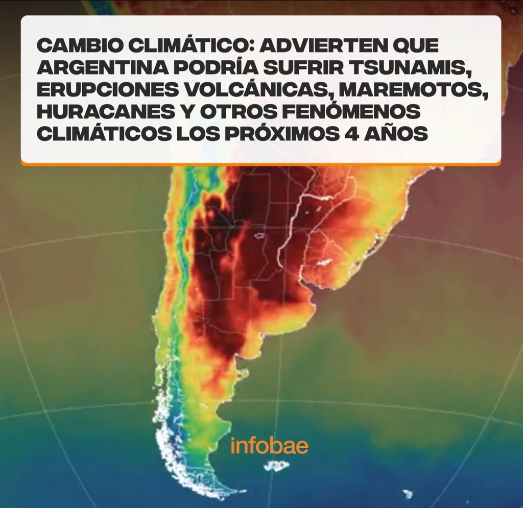 - Distintos usuarios han compartido que el medio argentino, Infobae, publicó una noticia titulada: «cambio climático: advierten que Argentina podría sufrir tsunamis, erupciones volcánicas, maremotos, huracanes y otros fenómenos climáticos los próximos 4 años».