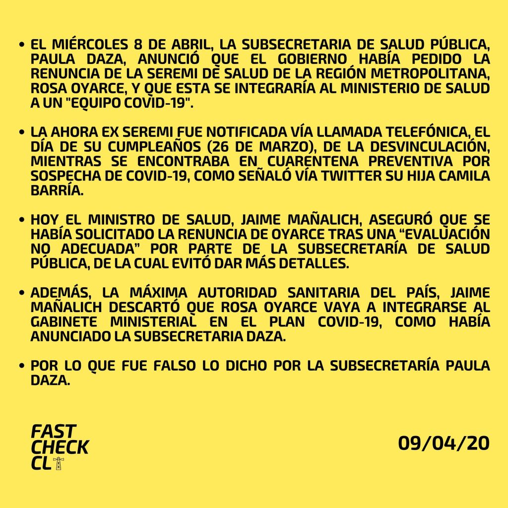 Es falso lo anunciado ayer 8 de abril por la subsecretaria Paula Daza, sobre la recontratación de Rosa Oyarce en el gabinete del Ministerio de Salud en el equipo Covid-19, tras ser desvinculada como Seremi de Salud RM,