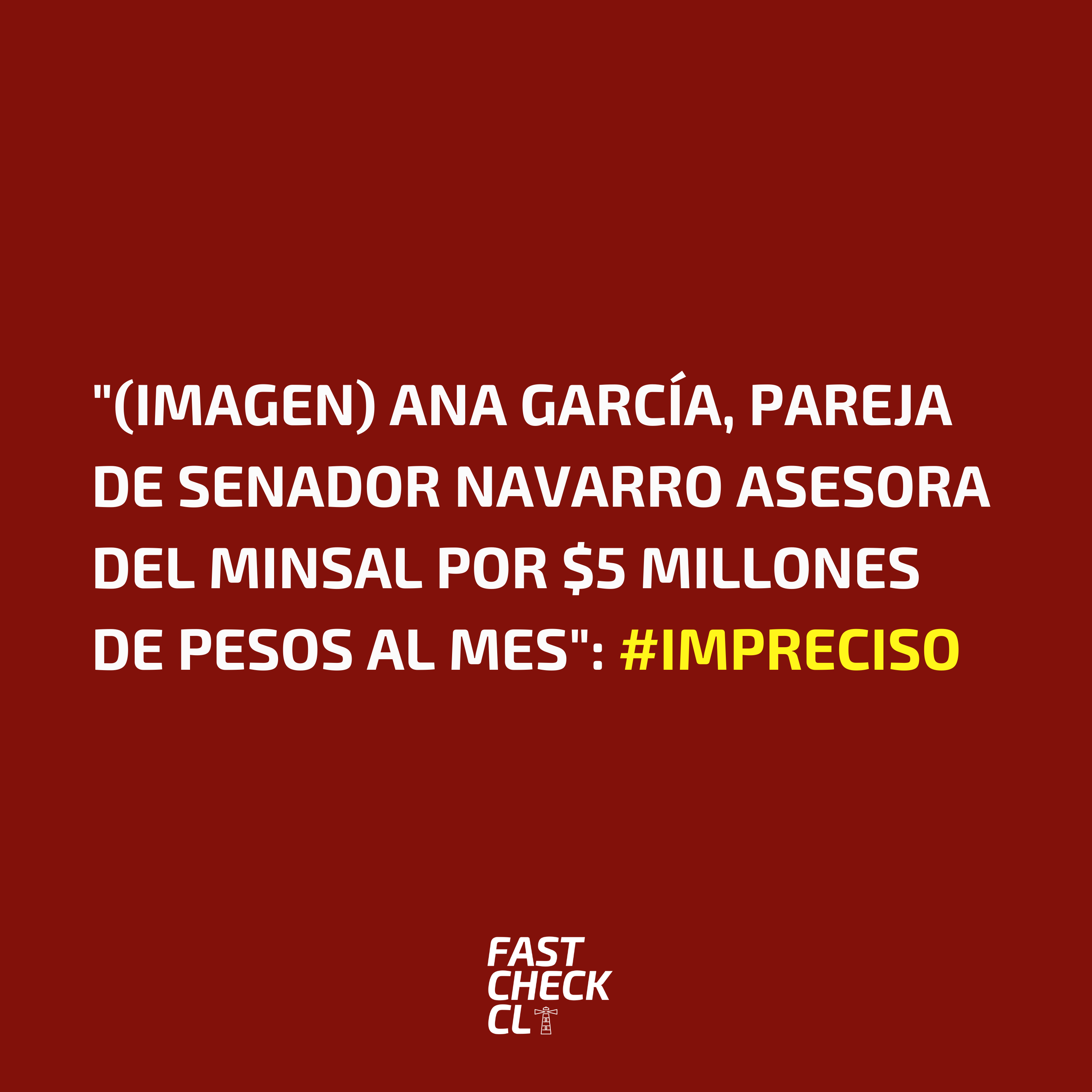 Fast Check CL verificó una imagen que circula por redes sociales que indica que la pareja del Senador Alejandro Navarro, sería una asesora del Ministerio de Salud y que ganaría 5 millones de pesos mensuales. Dicha información la catalogamos como imprecisa, porque García, no es su pareja, no ganó el monto consignado, pero sí estuvo contratada en el Minsal.