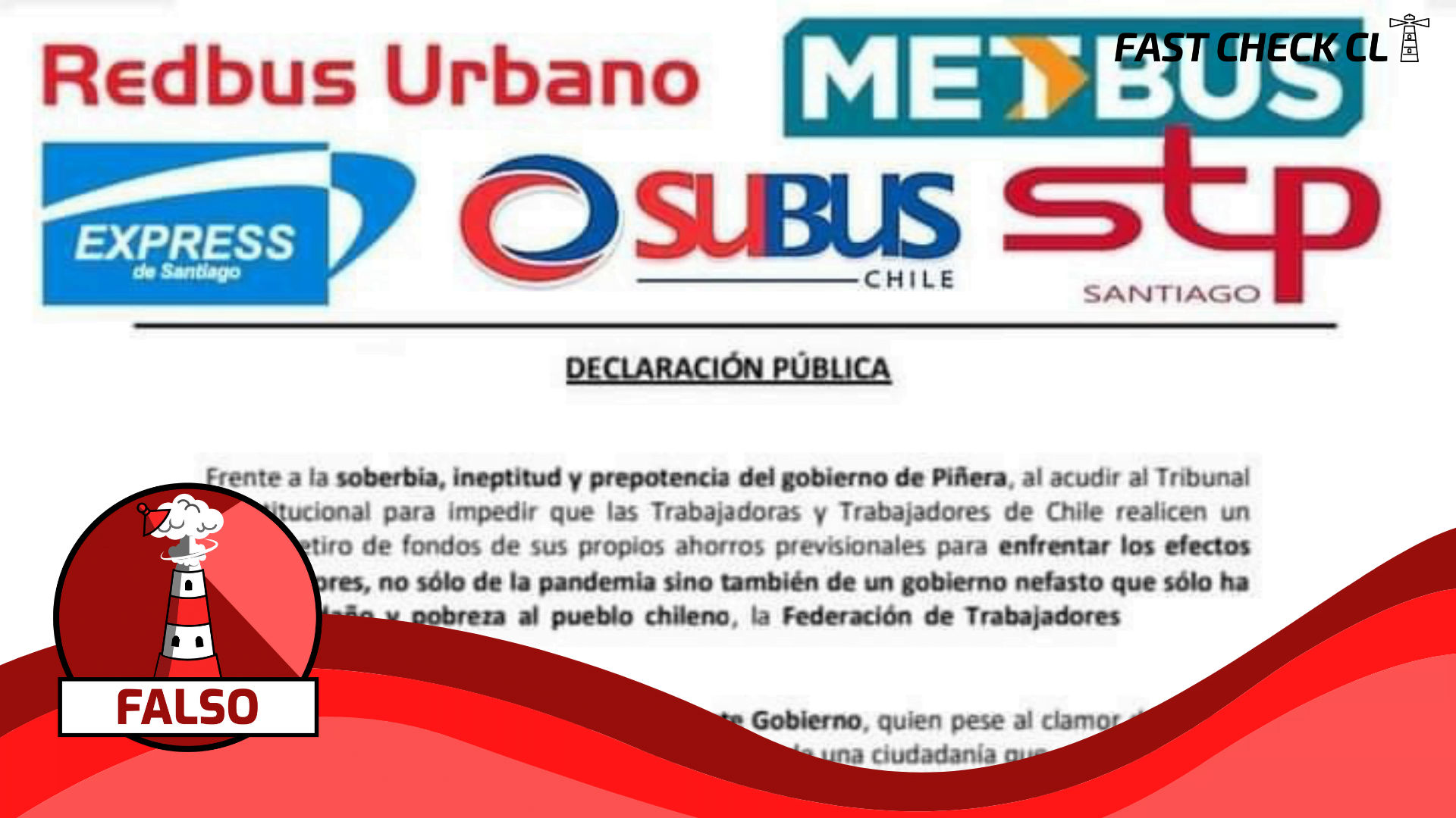 Durante esta semana comenzó a circular un comunicado en el cual, supuestamente, varias empresas del transporte público advertían sobre posibles movilizaciones. Esta declaración se dio a conocer como respuesta ante la decisión del Gobierno de llevar el proyecto del tercer retiro ante el Tribunal Constitucional. Fast Check CL contactó a las empresas aludidas y buscó el origen de la misiva, concluyendo que se trata de un documento adulterado y por lo tanto falso.