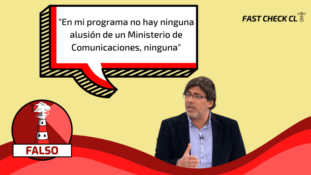 Fast Check CL calificó como falsa la afirmación entregada por el candidato presidencial, ya que en su programa de gobierno sí se habla de un Ministerio de Comunicaciones, específicamente se propone «evaluar la implementación de experiencias de ministerios de Información o Comunicaciones, existentes en diversos países del mundo».