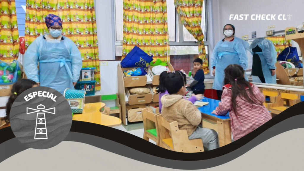 Al ingresar a una de las aulas, dos educadoras llevan consigo una pechera celeste y mascarilla. «Nuestra idea es cumplir el protocolo al pie de la letra. Una vez no contábamos con los elementos y tuve que suspender la jornada. El sostenedor no podía creerlo, pero acá está primero la vida», comenta Claret, de manera categórica. En tanto, tres niñas juegan con sus figuras, ojean libros y conversan con otros dos niños que miran atentamente nuestra presencia.