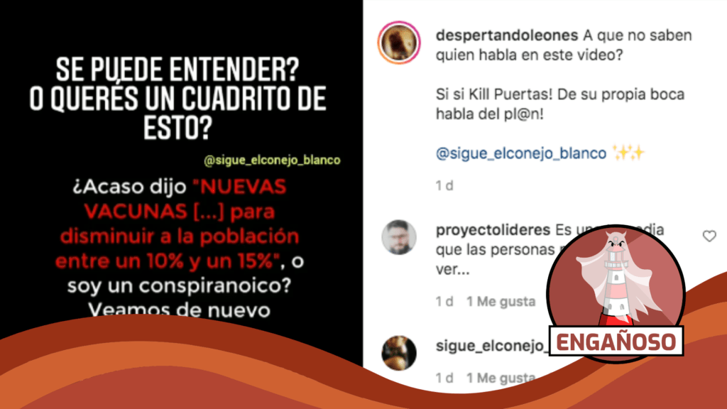 La cuenta de Instagram «despertandoleones» compartió un video en el que se asegura que Bill Gates, en una charla TED, declaró que si hacíamos un gran trabajo con nuevas vacunas podríamos disminuir a la población en un 10% o 15%. Fast Check CL calificó como engañosa la información, ya que la frase entregada en el video es sacada de contexto porque Bill Gates no se refiere a que las inyecciones asesinarán a la población, sino que tiene la convicción de que las nuevas vacunas disminuirán la mortalidad infantil y eso el crecimiento demográfico.