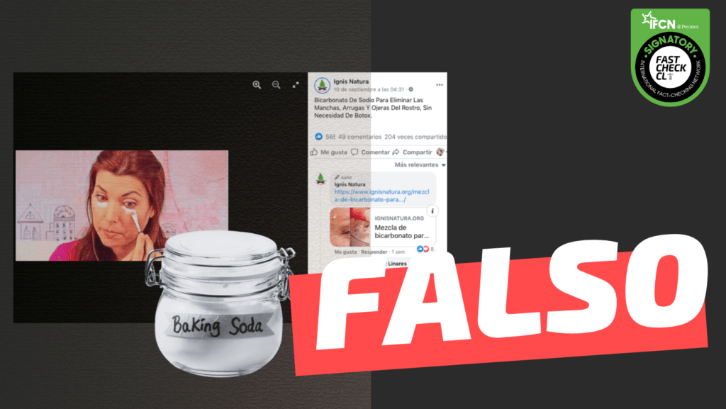 Fast Check CL calificó como falsa la afirmación entregada en Facebook por la cuenta Ignis Natura, ya que, de acuerdo a expertos, no hay evidencia científica que demuestre que el bicarbonato de sodio elimine arrugas, manchas y ojeras en el rostro. Además, aseguran que puede ser dañino para la piel.