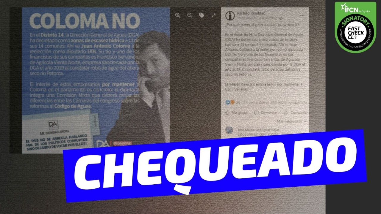 En Facebook, el Partido Igualdad subió un post el 14 de noviembre, en donde hacen las siguientes afirmaciones: las comunas del Distrito 14 han sido declaradas zonas de escasez hídrica; la empresa Agrícola Viento Norte fue multada por robo de agua; que el representante legal de esa empresa es tío y financista de campaña del diputado Juan Antonio Coloma (UDI); y que este último está en una Comisión Mixta de la reforma al Código de Aguas. Fast Check CL concluyó que hay tres aseveraciones reales y una imprecisa.