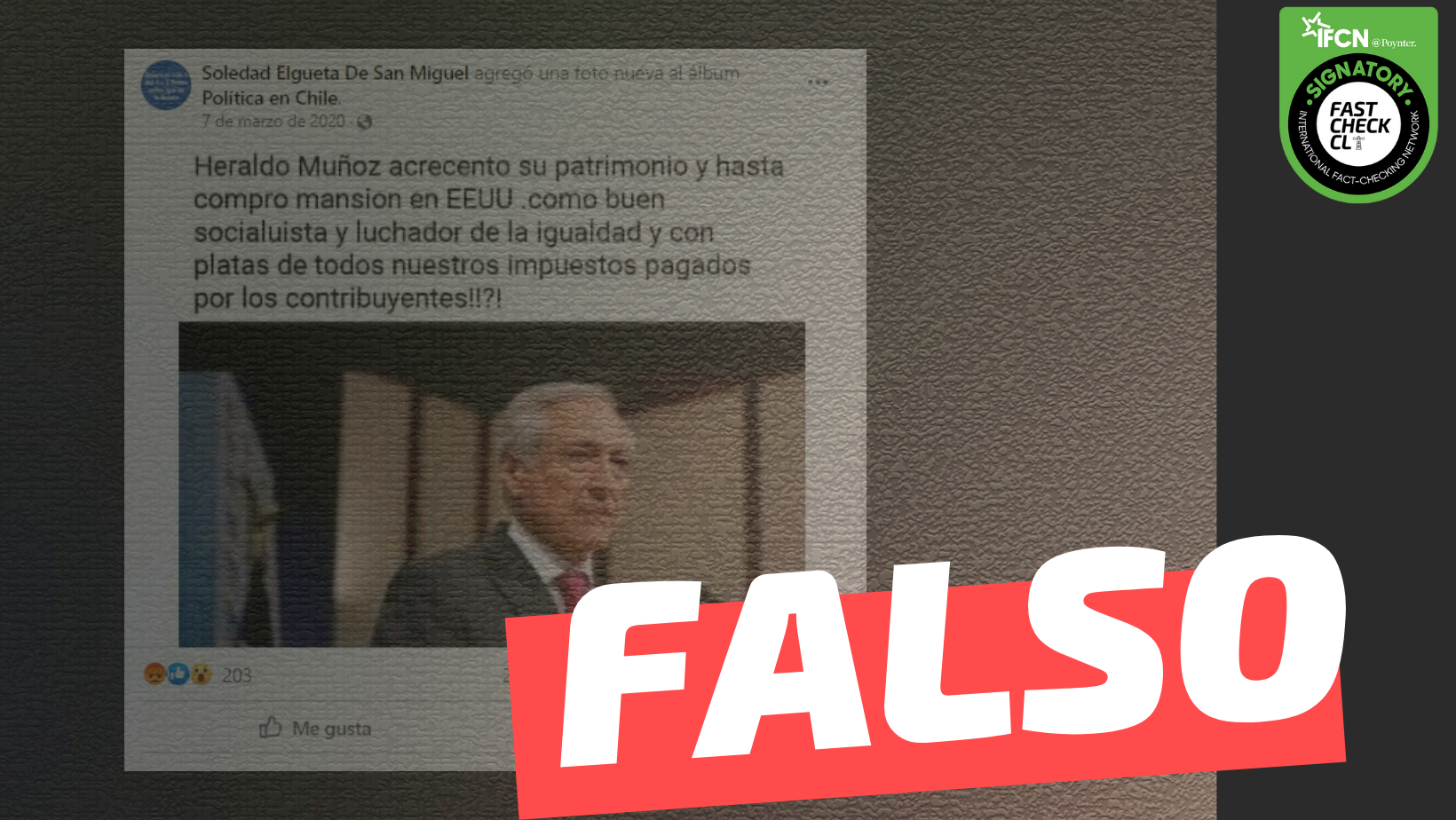 Una usuaria de Facebook compartió una imagen el 7 de marzo del 2020, en donde se puede ver al excanciller Heraldo Muñoz y la siguiente premisa: «Heraldo Muñoz acrecentó su patrimonio y hasta compró mansión en EE.UU. como buen socialista y luchador de la igualdad y con platas de todos nuestros impuestos pagados por los contribuyentes». El post ha sido difundido ampliamente en este último tiempo, alcanzando más de 15 mil veces compartidas.