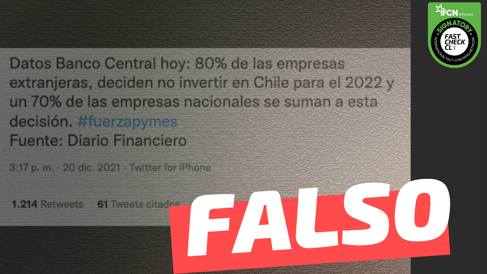 En Twitter comenzó a circular que, según datos del Banco Central, el 80% de las empresas extranjeras y el 70% de las nacionales han decidido no invertir en Chile para el 2022, atribuyendo la información a una publicación del Diario Financiero. Fast Check CL concluyó que la información es #Falso.