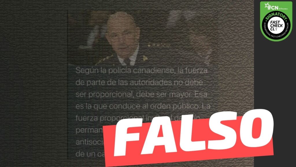 Desde el 26 de enero que está circulando en páginas chilenas de Facebook una imagen, que muestra a Robert Paulson, ex comisionado de la Real Policía Montada de Canadá, que afirma que según la policía canadiense, el uso de la fuerza de las autoridades debe ser mayor que la de la población civil. Fast Check CL no encontró registros de que Paulson haya expresado esa frase, al contrario, ha dicho en ocasiones que la policía debe ser reflexiva y deliberada.