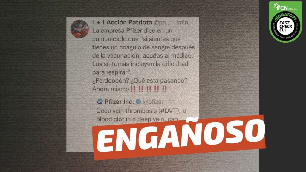 Por esta razón, Fast Check CL considera engañoso lo que se expresa en redes sociales, dado que si bien es verdad que Pfizer recomendó en un tuit estar atentos a los síntomas de la trombosis venosa profunda (TVP), es falso que ellos hagan esta recomendación porque la vacuna de este laboratorio sea una causante de la TVP.
