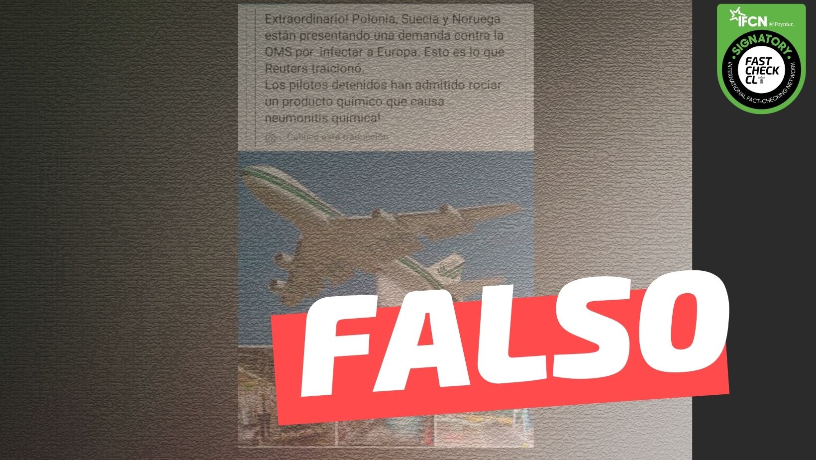 Desde inicios de año se ha comenzado a difundir una captura de pantalla que muestra a un avión arrojando un líquido -como cuando apagan incendios forestales- acompañada con la siguiente frase: «Extraordinario! Polonia, Suecia y Noruega están presentando una demanda contra la OMS por infectar a Europa. Esto es lo que Reuters traicionó. Los pilotos detenidos han admitido rociar un producto químico que causa neumonitis química!».