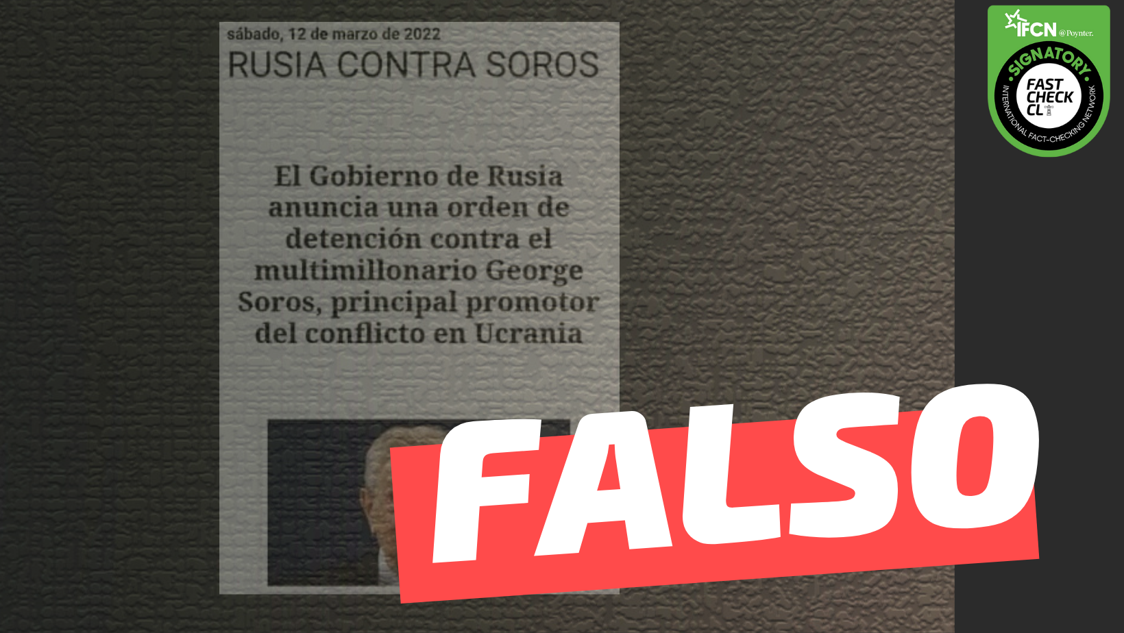 En redes sociales circula una imagen de un portal de noticias que anuncia una supuesta orden de detención propiciada por el gobierno de Rusia en contra del multimillonario George Soros, quien, según se dice, es el «principal promotor del conflicto en Ucrania». Esto es falso, puesto que no hay registros oficiales del gobierno y, además, desde 2018 que verificadores han desmentido que el Kremlin haya emitido una orden de arresto en contra de Soros.
