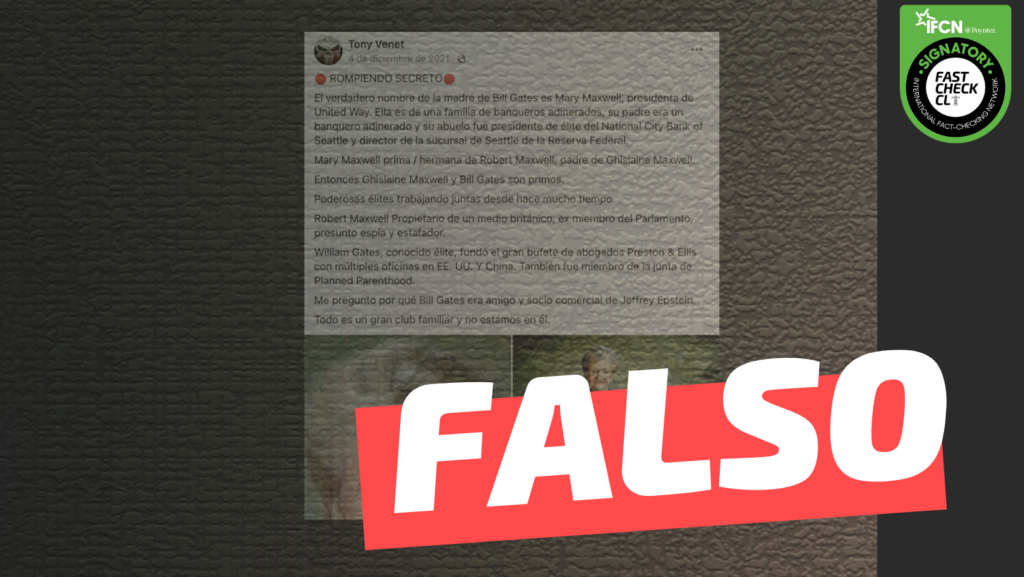Comenzó a circular por redes sociales que la madre de Bill Gates, Mary Ann Maxwell, era hermana del padre de Ghislaine Maxwell, Robert Maxwell, convirtiendo al fundador de Microsoft en primo de la socialité británica. Fast Check CL calificó como falsa la información, pues no hay ningún registro que demuestre que son parientes, al contrario, la madre de Bill Gates no tuvo hermanos y Robert Maxwell no tenía ese apellido originalmente.