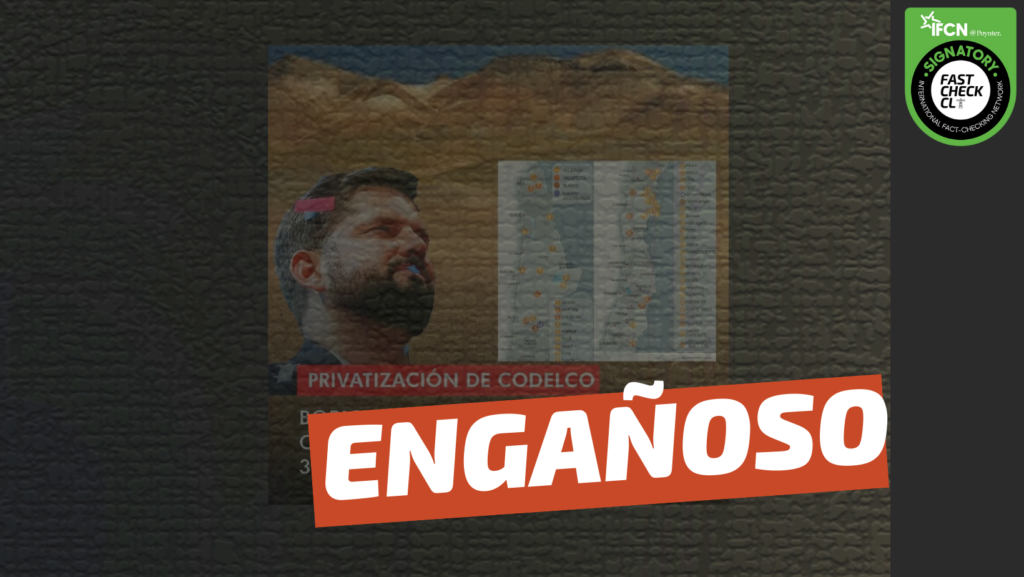 - Se ha estado compartiendo una imagen que afirma que «Boric inicia la privatización de Codelco ofertando en Canadá 34 proyectos de la cuprífera estatal».