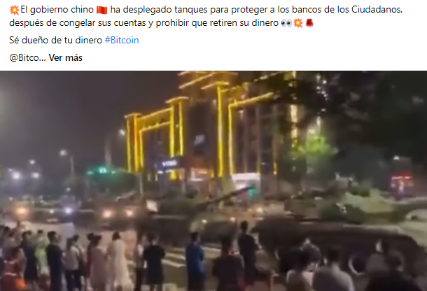- Con un video como evidencia, se asegura que «el gobierno chino ha desplegado tanques para proteger a los bancos de los ciudadanos, después de congelar sus cuentas y prohibir que retiren su dinero». La información es falsa.