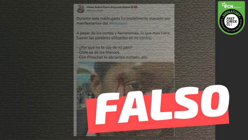 Desde el viernes 2 de septiembre que circula un tuit (1) de una persona que denuncia una presunta agresión por parte de manifestantes del Rechazo. Para evidenciar el hecho, se adjunta una fotografía con heridas expuestas en la cara. Aparentemente el usuario, llamado André Pierre, es de nacionalidad haitiana: