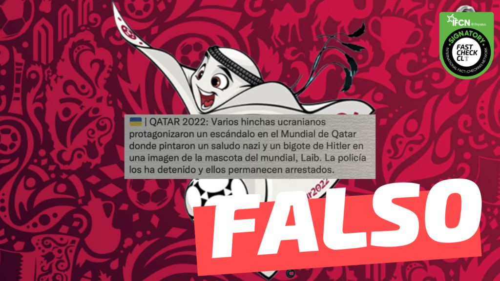 Circula en redes sociales una nota audiovisual del medio qatarí Al Jazeera, exponiendo que hinchas ucranianos han sido detenidos por la policía de Qatar, luego de hacer alusiones nazis a La’eeb, la mascota de la Copa Mundial 2022. Sin embargo, Al Jazeera desmintió haber publicado esta noticia y tampoco hay registros de que ucranianos hayan sido detenidos, por lo que Fast Check CL calificó el contenido como #Falso.