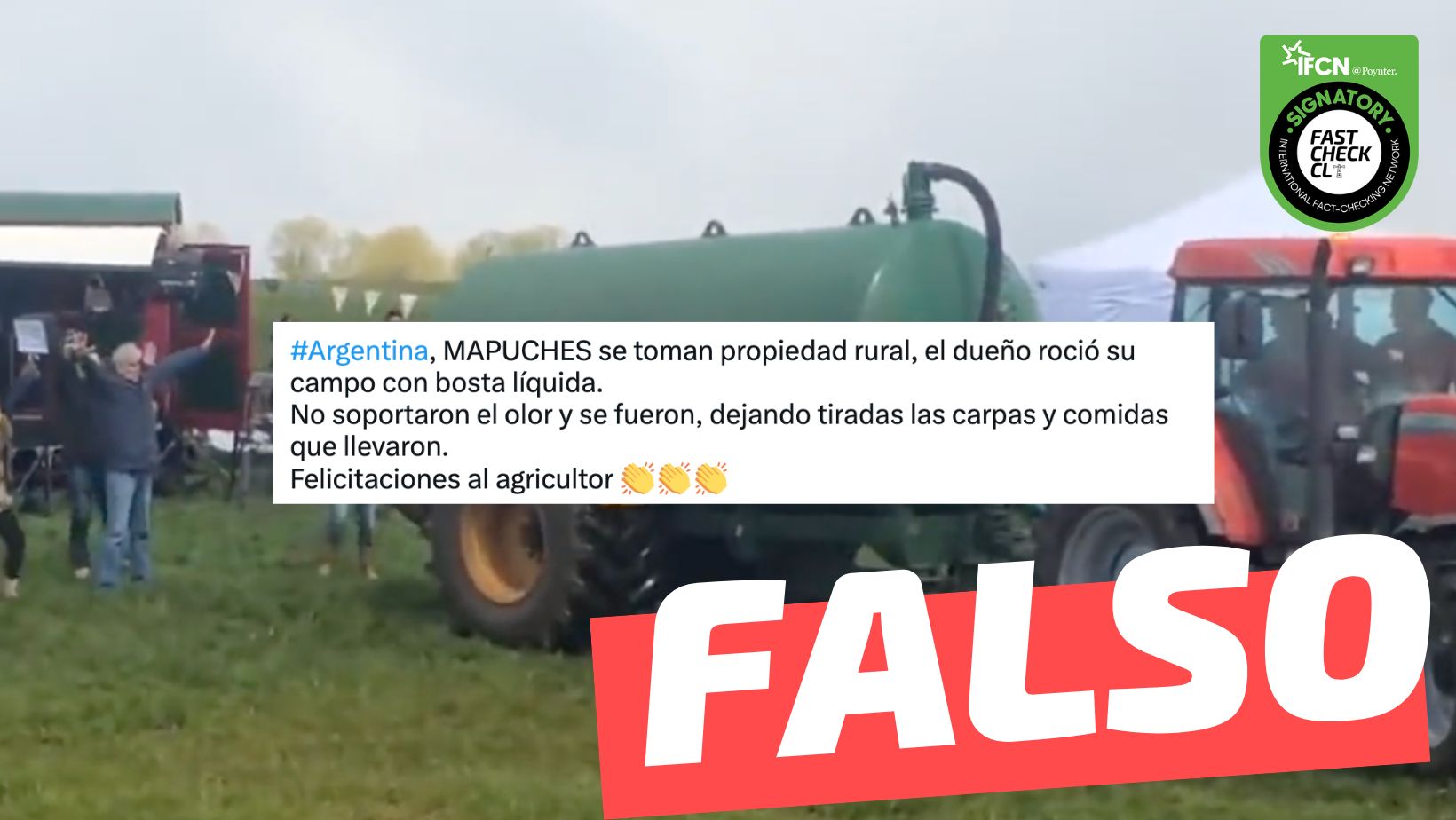 Durante febrero circuló un video denunciando que en una zona rural de Argentina, el dueño de un campo roció con estiércol una zona en donde habría una toma mapuche. Sin embargo, los hechos se remontan a 2016 y sucedió en Inglaterra, por lo que calificamos el contenido como #Falso.