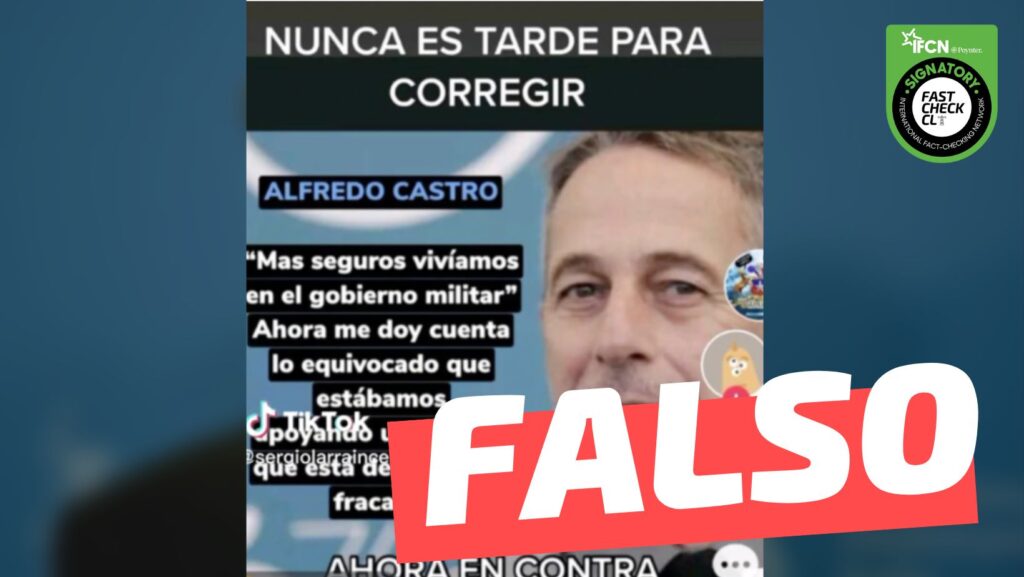 El 8 de marzo un usuario en TikTok publicó una imagen del reconocido actor Alfredo Castro y se le adjudica la siguiente frase: «Más seguros vivíamos en el gobierno militar». La publicación posee más de 285,4 mil visualizaciones, 10,4 mil me gusta y ha sido compartida en más de 1.800 oportunidades.