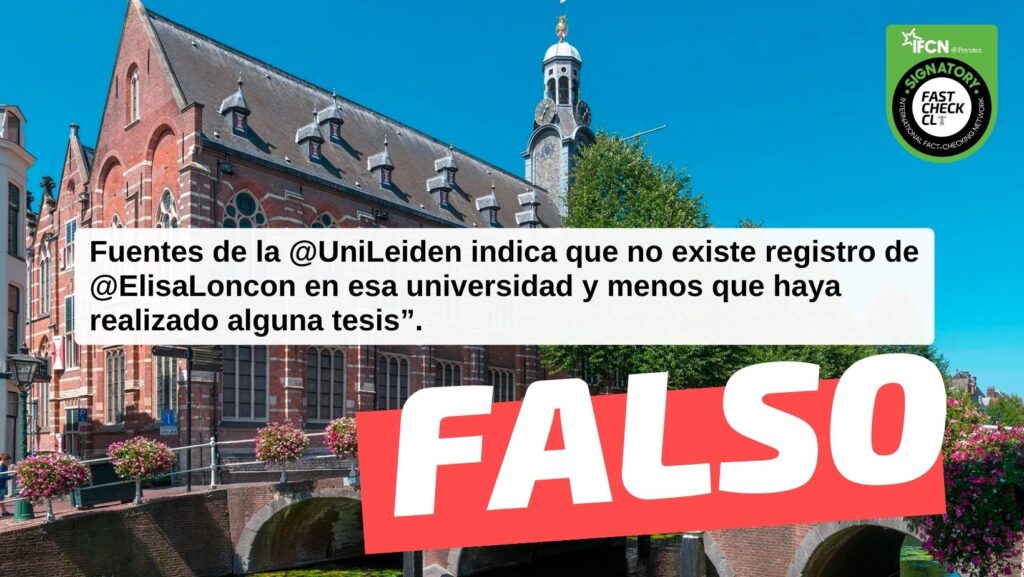 Aseguran en redes sociales que «fuentes de la Universidad de Leiden» indicaron que no existen registros de Elisa Loncon en dicha casa de estudios «y menos que haya realizado una tesis». Pero esta información es falsa, ya que existes registros públicos que desmienten la premisa inicial.