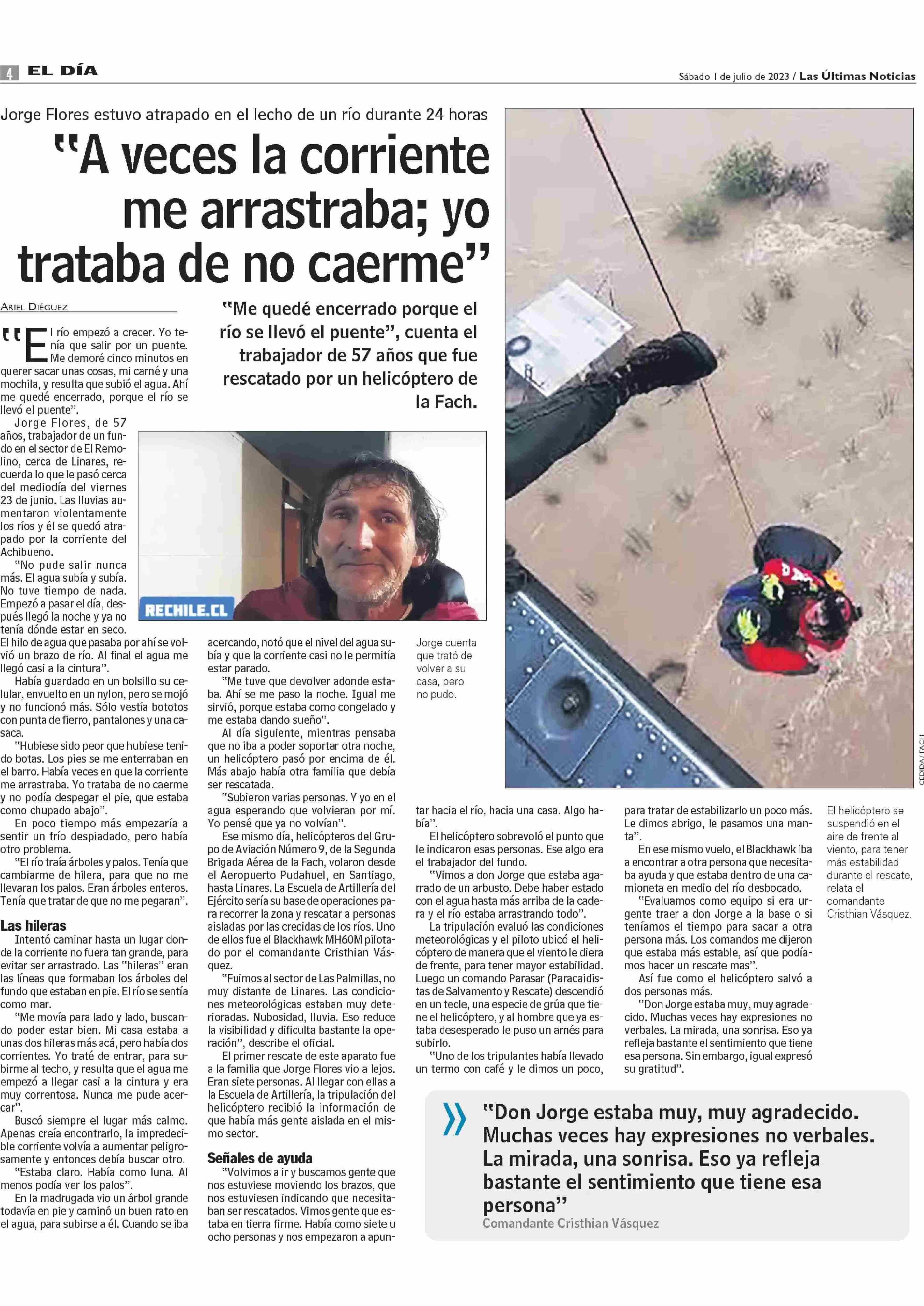 Distintos reportes de prensa dieron cuenta de esta situación, entre ellos Chilevisión que consignó: «Por la emergencia climática, los equipos de las Fuerzas Armadas de Chile debieron hacer un intenso trabajo para ayudar a las cientos de personas que quedaron aisladas por el temporal. Tal como el caso de Jorge Flores, un hombre de 61 años que resistió más de 24 horas aferrado a un árbol para no ser arrastrado por la corriente del Río Achibueno, en Linares».
