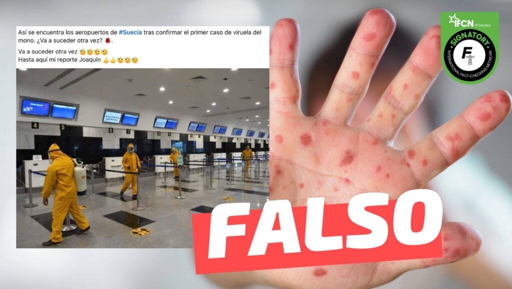 Se viraliza una fotografía que supuestamente muestra el aeropuerto de Suecia luego de que se confirmara el primer caso de Mpox (o viruela símica) en su territorio, donde se ve a cuatro personas limpiando con trajes de protección química. Esto es falso, la fotografía se tomó el año 2021 en Egipto en medio de la pandemia de covid-19.