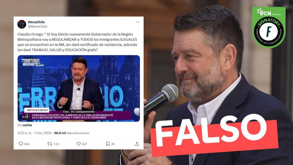 El equipo de Fast Check CL determinó que este contenido es #Falso. No existe registro de que la frase viralizada haya sido emitida por Claudio Orrego. Además, su equipo desmintió la publicación y facilitó el registro completo de la entrevista donde el candidato a gobernador nunca propone “regularizar a todos los inmigrantes ilegales”.