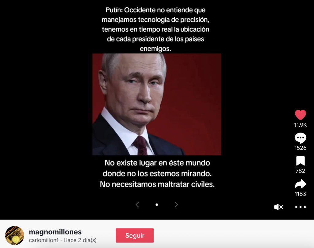 En medio de la creciente tensión entre Rusia y Occidente, se viralizó en TikTok una publicación que comparte que el presidente de Rusia, Vladimir Putin, aseguró tener la ubicación en tiempo real de los mandatarios de países enemigos.