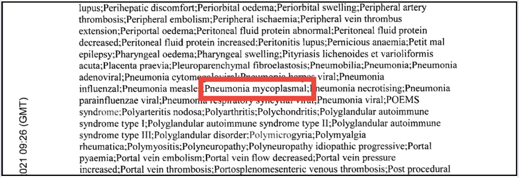 Efectivamente se ve que dentro del largo listado aparece el nombre “pneumona mycoplasmal”, sin embargo, los nombres que aparecen en el documento hacen referencia a “efectos adversos de especial interés” (1) que, de acuerdo al Instituto de Salud Pública corresponde a: