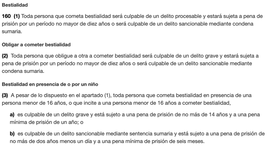 El enlace remite al sitio del «Servicio de Fiscalía Pública de Canadá», donde se indica en el Apéndice A los «Nuevos delitos y nuevas penas mínimas obligatorias para la explotación sexual de los niños». Allí, una tabla muestra que en la Ofensa nº2 se encuentra el Bestialismo, correspondiente a la sección 160 (3) del Código Penal.