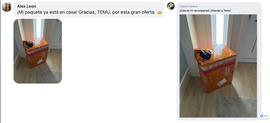 Otro elemento que llama la atención es que los comentarios dentro del sitio web tienen gran cantidad de ‘likes’, pues el que menos tiene son 126. Asimismo, los de la publicación en Facebook que aseguran haber recibido el paquete son de personas que en sus perfiles informan ser de ciudades de México, por lo que se presume que pertenecen a cuentas bot, ya que supuestamente la oferta es de Temu Chile.