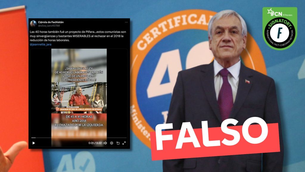 Fast Check califica el contenido como #Falso. El proyecto de las 40 horas fue presentado por diputadas de oposición en 2017, no por el expresidente Sebastián Piñera. Aunque su gobierno presentó una propuesta distinta, fue la iniciativa de Vallejo y Cariola la que se convirtió en ley.
