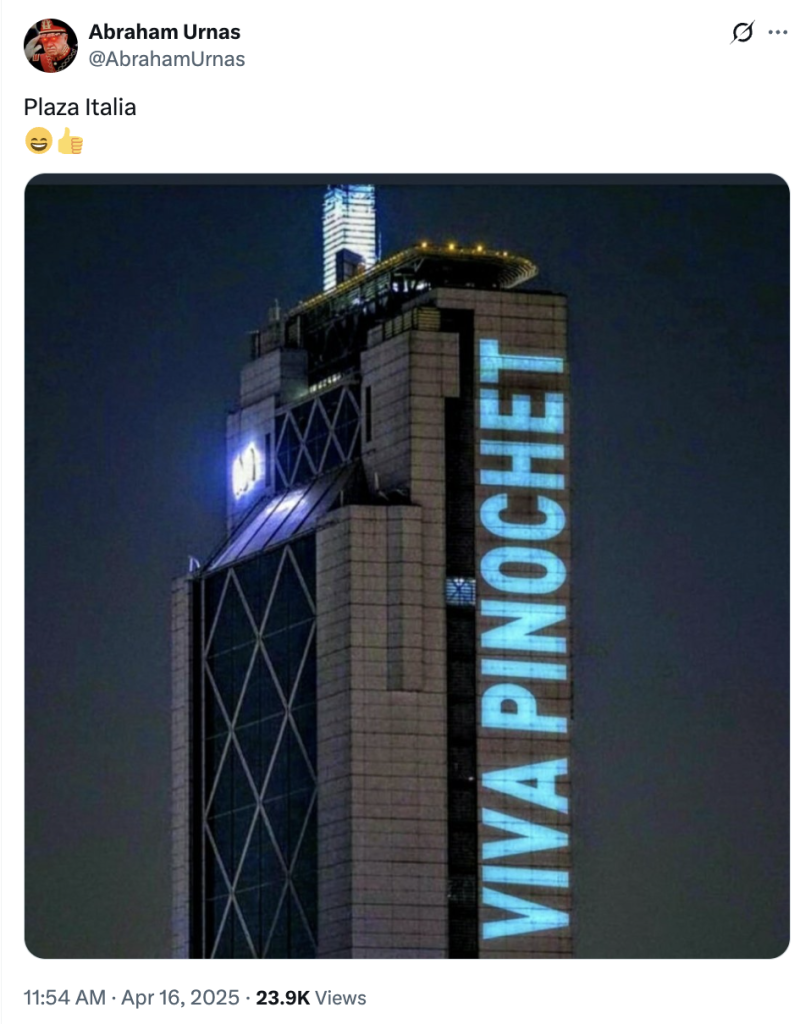 En este escenario comenzó a circular en X una imagen que muestra la Torre Telefónica, ubicada en el centro de Santiago, con una supuesta proyección lumínica del mensaje: «Viva Pinochet». En Fast Check CL verificamos esta imagen y concluimos que se trata de un contenido #Falso.