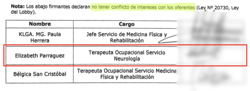 Esta redacción detectó que Parraguez —quien se desempeñó como apoyo clínico en el área de neurología del hospital, entre el año 2012 y 2023—, participó como referente técnico en al menos cinco licitaciones del hospital. En estos procesos, que incluían convenios de suministro de ortesis, telas compresivas e insumos de rehabilitación, la funcionaria tuvo un rol como evaluadora, asignando puntajes y emitiendo opiniones técnicas, pese a que una de las oferentes era la empresa de su madre. En dos de estas licitaciones firmó que no existía conflicto de interés.