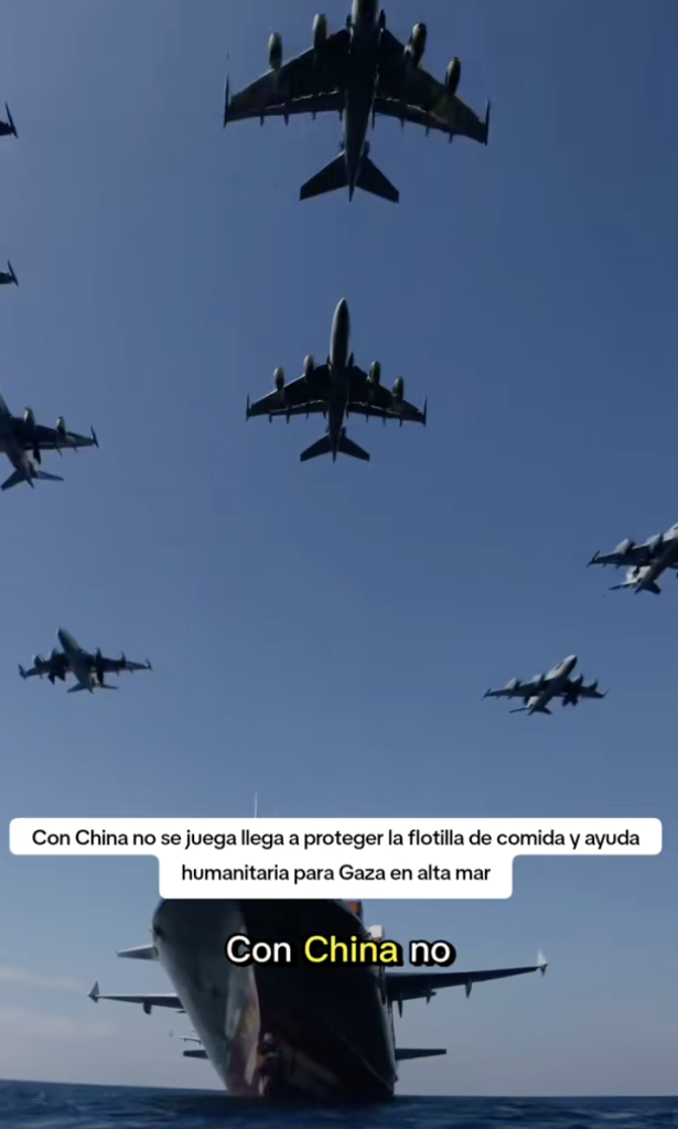 Bajo este contexto, se comparte en TikTok un video con más de 100 mil visualizaciones, afirmando que China habría enviado aviones de guerra para escoltar y proteger la flotilla. La voz que narra asegura: