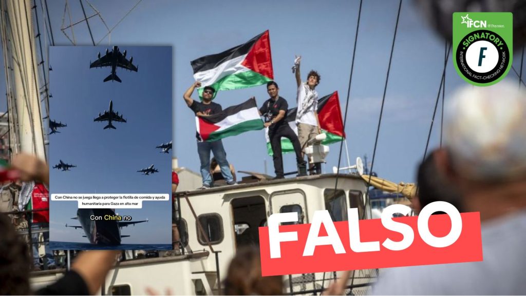 Fast Check califica el contenido como #Falso. No hay reportes oficiales de que China enviara aviones de guerra para escoltar a la flotilla que se dirige a Gaza con ayuda humanitaria. Reportes indican que Italia y España enviaron barcos militares, los cuales finalmente regresaron a sus respectivos países.