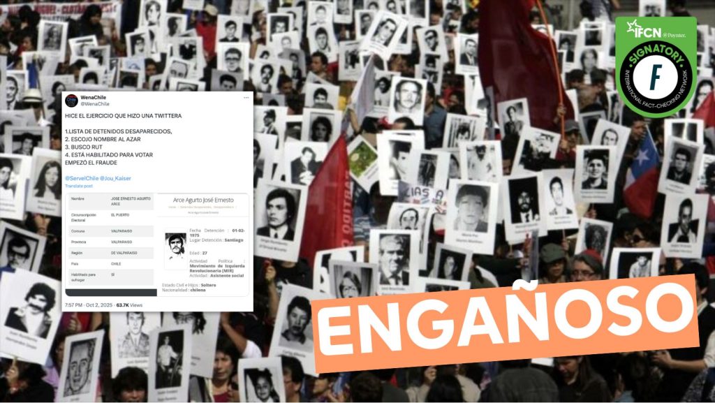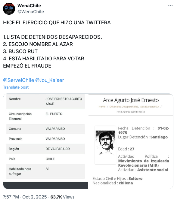 Un usuario en X compartió que supuestamente los detenidos desaparecidos están habilitados para sugrafar en las próximas elecciones presidenciales, constituyendo así un fraude. Fast Check califica esto como #Engañoso. El propio Servel informa que, si bien los detenidos desaparecidos aparecen habilitados para votar, esto es solo de forma simbólica y nadie puede votar en nombre de ellos.