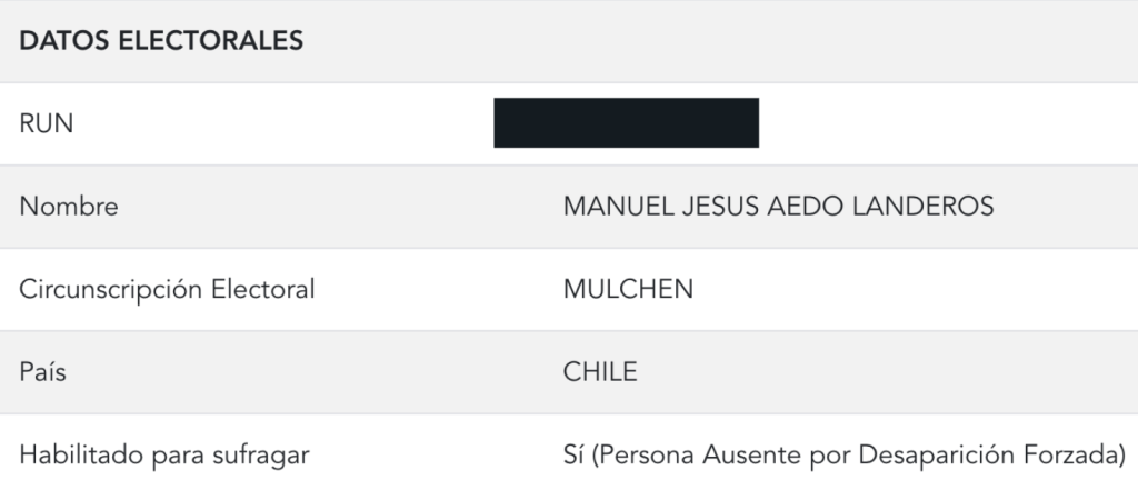 Captura de datos electorales de persona ausente por desaparición forzada en Servel.