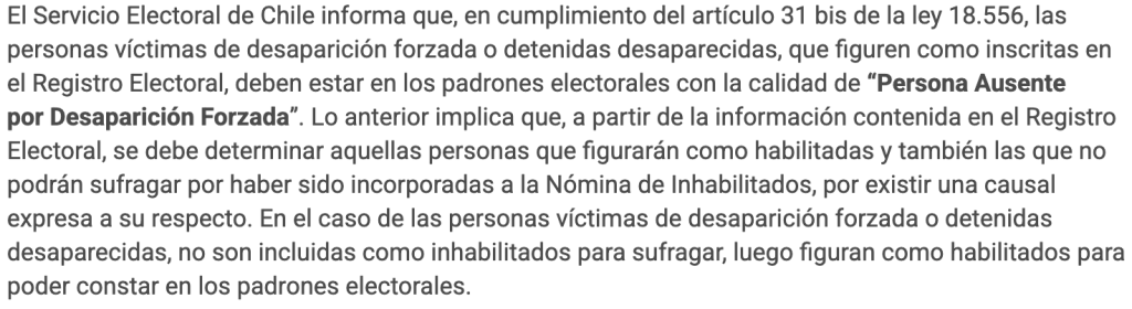 En 2022, Fast Check verificó este mismo contenido en el contexto del plebiscito constitucional de ese año. Para dicha ocasión, se consultó a Servel y explicaron que tras las modificaciones a la Ley 18.556, específicamente en el artículo N°31, establecieron que las personas que aparezcan en el Informe Rettig o en la Comisión Nacional de Reparación, por ejemplo, «estén en los padrones electorales que se determinen para cada elección o plebiscito con la calidad de “Persona Ausente por Desaparición Forzada”».