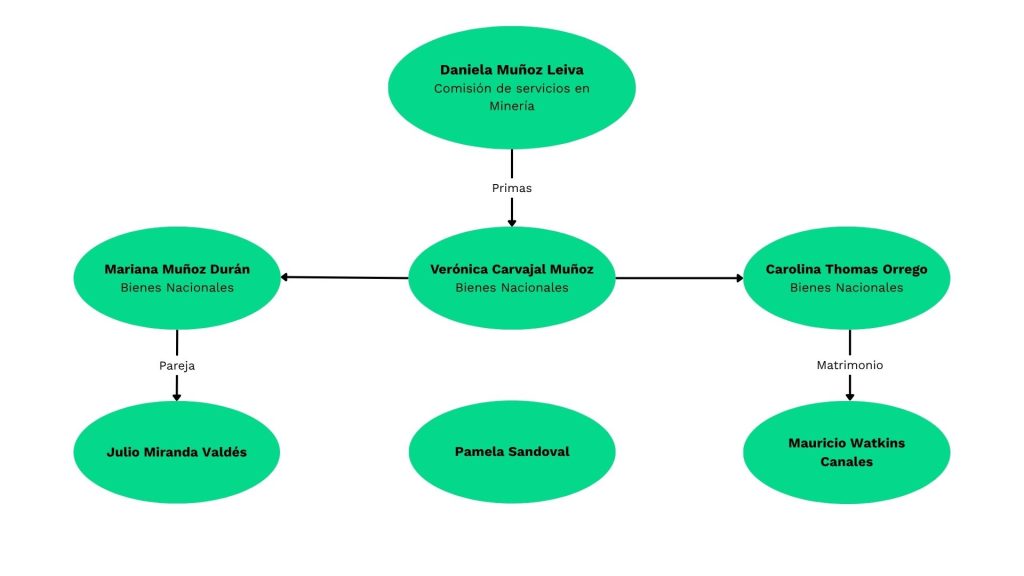 Verónica Carvajal, según describe la denuncia, envió una cotización a Cliodinámica que incluía un equipo de trabajo compuesto por funcionarios del Ministerio de Bienes Nacionales y sus parejas. Figuraban: la propia Carvajal Muñoz, Mariana Muñoz Durán, Carolina Thomas Orrego, Mauricio Watkins Canales (esposo de Thomas Orrego), Julio Miranda Valdés (pareja de Muñoz Durán) y Pamela Sandoval.