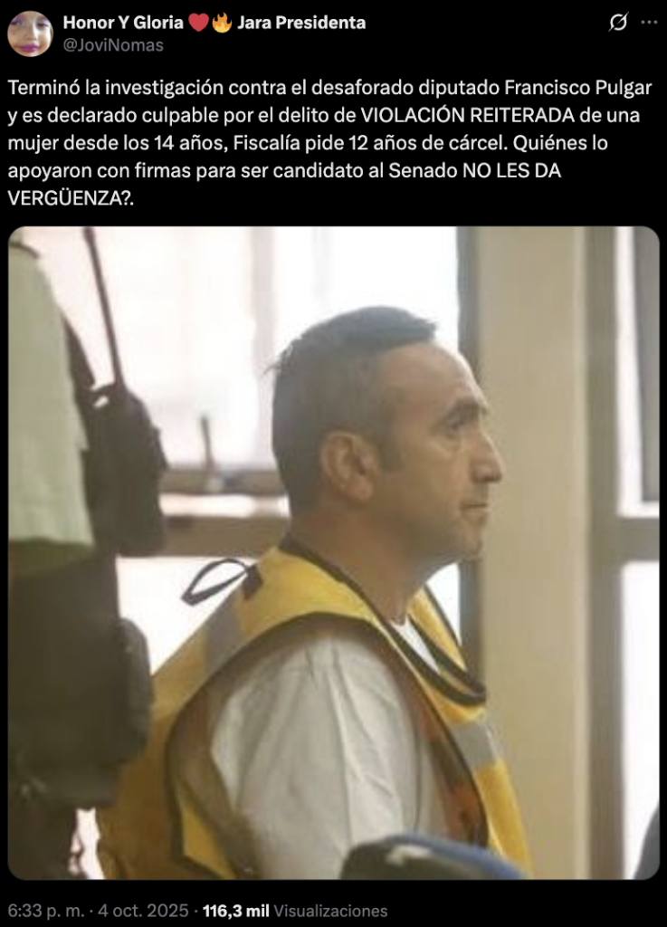 «Terminó la investigación contra el desaforado diputado Francisco Pulgar y es declarado culpable por el delito de violación reiterada de una mujer desde los 14 años, Fiscalía pide 12 años de cárcel. Quienes lo apoyaron con firmas para ser candidato al Senado, ¿no les da vergüenza?», comenta el usuario.