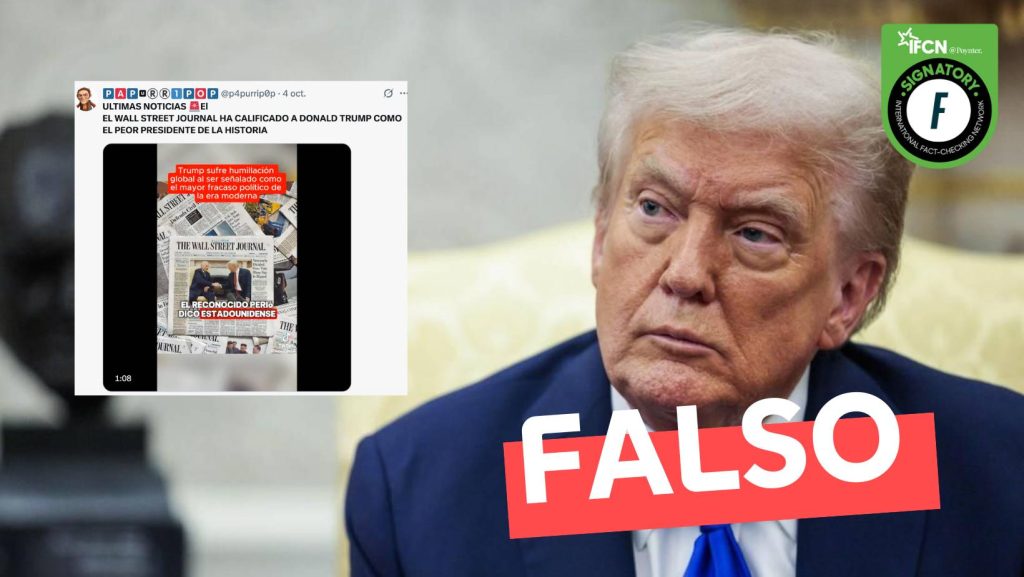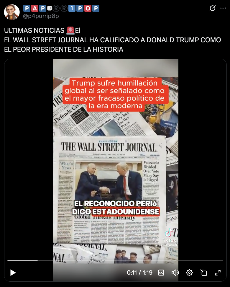 En el video verificado, cuando se afirma que el WSJ posicionó a Donald Trump como el peor presidente de la historia, se muestra una supuesta portada del periódico como prueba. No obstante, la imagen utilizada corresponde en realidad a otra noticia.