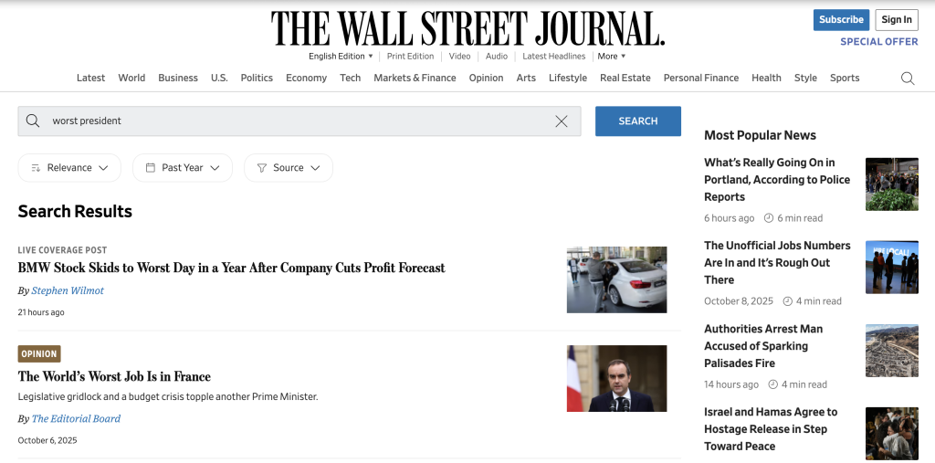 Además, se realizaron búsquedas directamente en el sitio web de The Wall Street Journal, usando las expresiones «lista peor presidente», «peor presidente» y «Donald Trump peor presidente» (en inglés). Tampoco se encontraron resultados que indiquen la existencia de una lista elaborada por el diario con estas características.