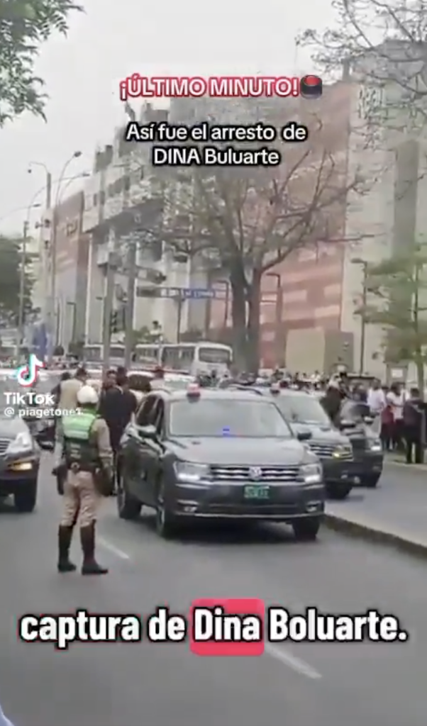 En redes se hizo viral un video que supuestamente muestra cuando es detenida por fuerzas policiales (1,2). El registro es acompañado por una voz que consigna: «Así fue la captura de Dina Boluarte. Gracias a la buena intervención policial se está logrando la captura más grande a favor del Perú».