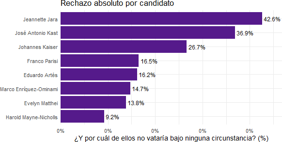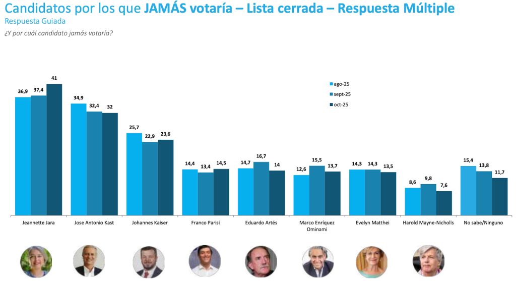 De la misma forma, la encuestadora DATAVOZ inquirió en septiembre a los votantes por cuáles candidatos no elegiría «bajo ninguna circunstancia». Kast obtuvo 36,9% del rechazo, antecedido de Jeannette Jara (42,6%) y seguido por Johannes Kaiser (26,7%).