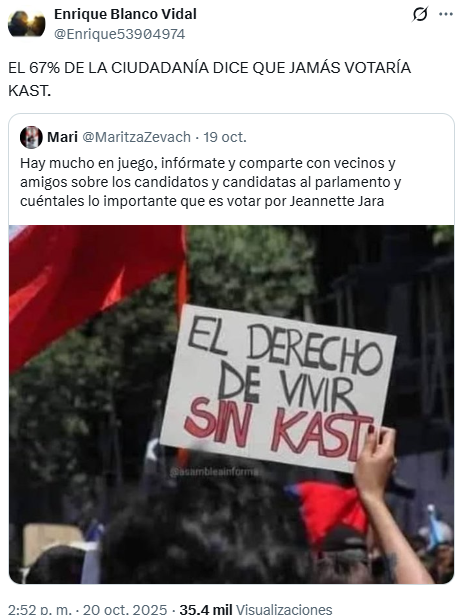 Un usuario en X afirmó que «67% de la ciudadanía dice que jamás votaría por Kast». La publicación acumula más de 35 mil visualizaciones.