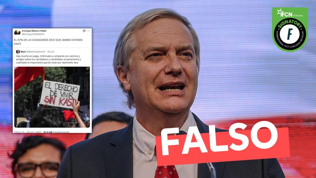Un usuario en X afirmó que «67% de la ciudadanía dice que jamás votaría por Kast». La publicación acumula más de 35 mil visualizaciones.