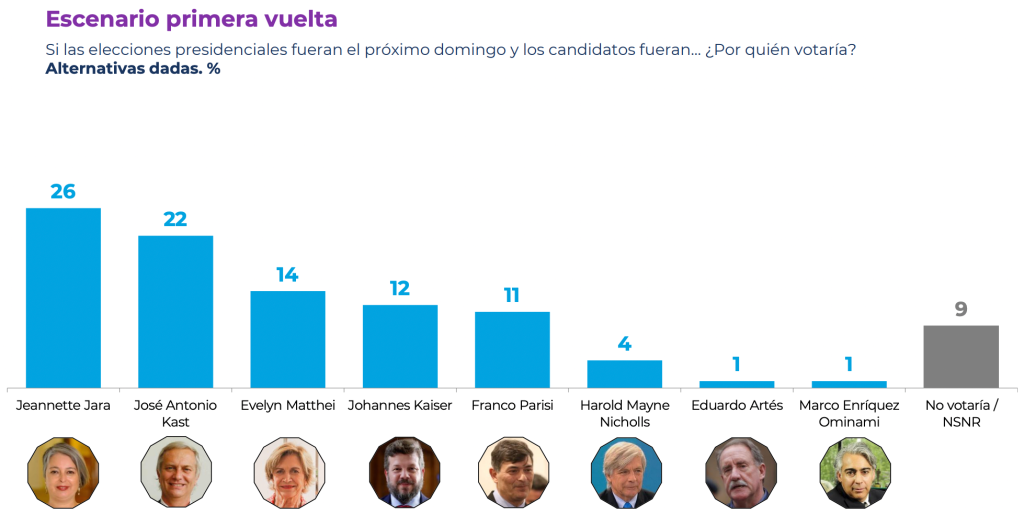 Durante la madrugada de este jueves 23 de octubre se viralizó una supuesto gráfica de la Encuesta ‘Plaza Pública’ de Cadem que proyecta los candidatos preferidos para la primera vuelta de la elección presidencial. La publicación —que ya acumula más de 65 mil visualizaciones— muestra el siguiente orden de los candidatos y sus respectivos porcentajes: