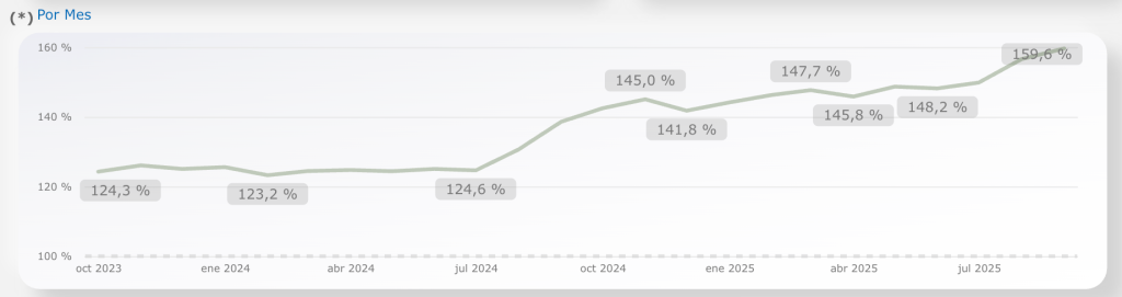 El mismo apartado exhibe la evolución que ha tenido Santiago I desde octubre de 2023, fecha desde la cual no se ha registrado una ocupación menor al 123.2%. Por lo demás, la tendencia muestra un aumento sostenido en su población carcelaria, como se puede observar a continuación:
