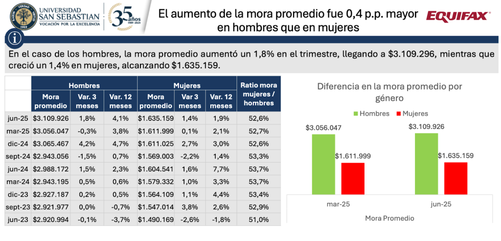 Se analizó un informe de junio de 2025 de la Universidad San Sebastián en conjunto con la agencia de informes crediticios Equifax, firma que administra DICOM. En su diapositiva número 20, se desglosa la cantidad de personas morosas por género.