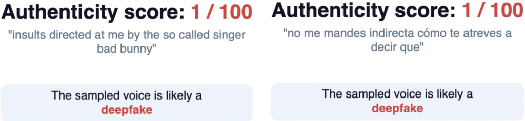Escuchando los videos también se identificó que las voces no suenan totalmente naturales, levantando sospechas de uso de inteligencia artificial (IA). Por tanto, se procedió a someter los audios de ambos en HIya, herramienta de detección de IA. Para los dos dos casos, esta arrojó un 99% de probabilidades se haber generado las voces de Donald Trump y Bad Bunny sintéticamente.
